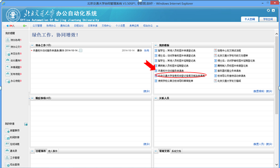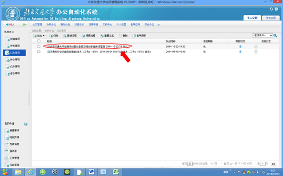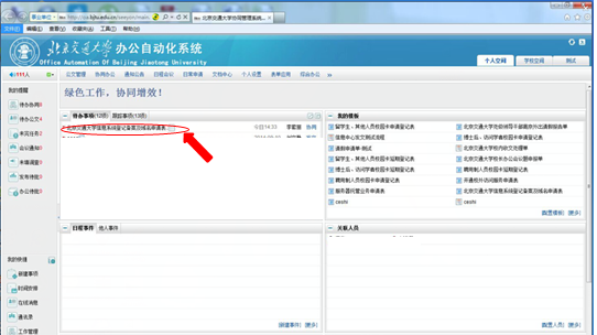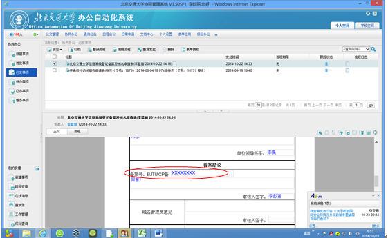 1、  部门主管同样登录到http://oa.bjtu.edu.cn,进入如下页面,在待办事项中,会出现发起人发起的备案申请。如图5所示: