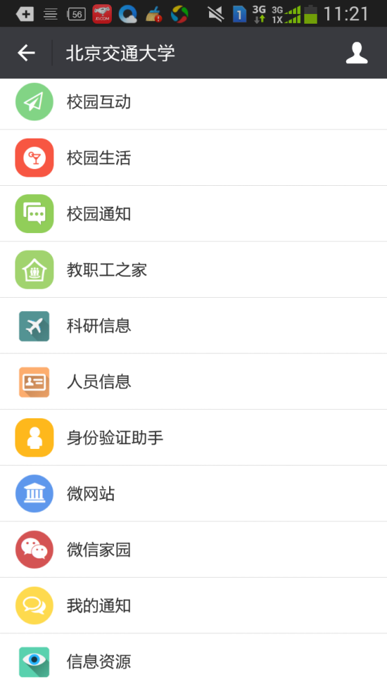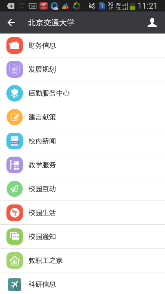 1.  微信右上角添加朋友,然后选择查找“公众号”,输入“北京交通大学”后搜索,选择红色校徽的北京交通大学,点击后关注。