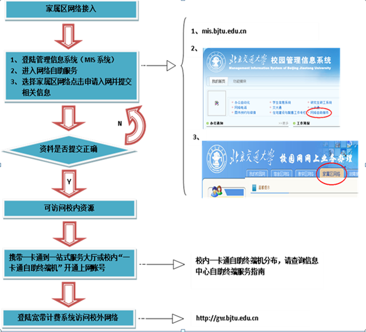如果用户在家属区住宅通过有线方式接入网络,首先需要登录管理信息系统(MIS系统),并选择网络自助服务系统进行网卡MAC地址等信息的注册,注册成功后才可以接入网络。如果用户需要访问校园网出口外的互联网资源,还需要经过出口计费系统的认证,即用户还需要申请一个上网账号。
