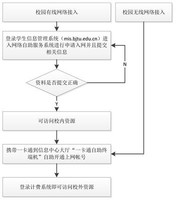 无线接入用户同样需要携带一卡通在自助终端机上开通并激活账号,然后通过校园无线网,经过认证后即可同时访问校内、校外资源。