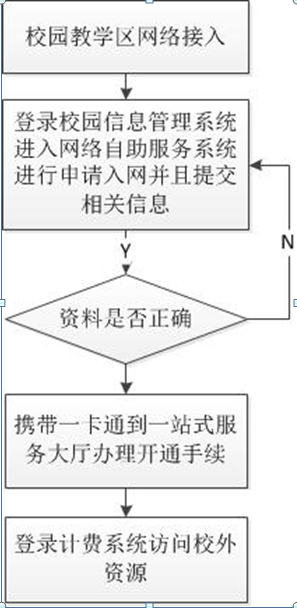 如果用户在教学楼通过有线方式接入校园网,首先需要登录校园管理信息系统,并选择网络自助服务系统进行网卡MAC地址、上网地点等信息的注册,注册成功后需要前往一站式服务大厅办理开通手续,即可接入校园网络。如果用户需要访问校园网出口外的互联网资源,还需要经过出口计费系统的认证,即用户还需要申请一个上网账号,此账号也可以提供用户通过无线方式认证接入校园网。